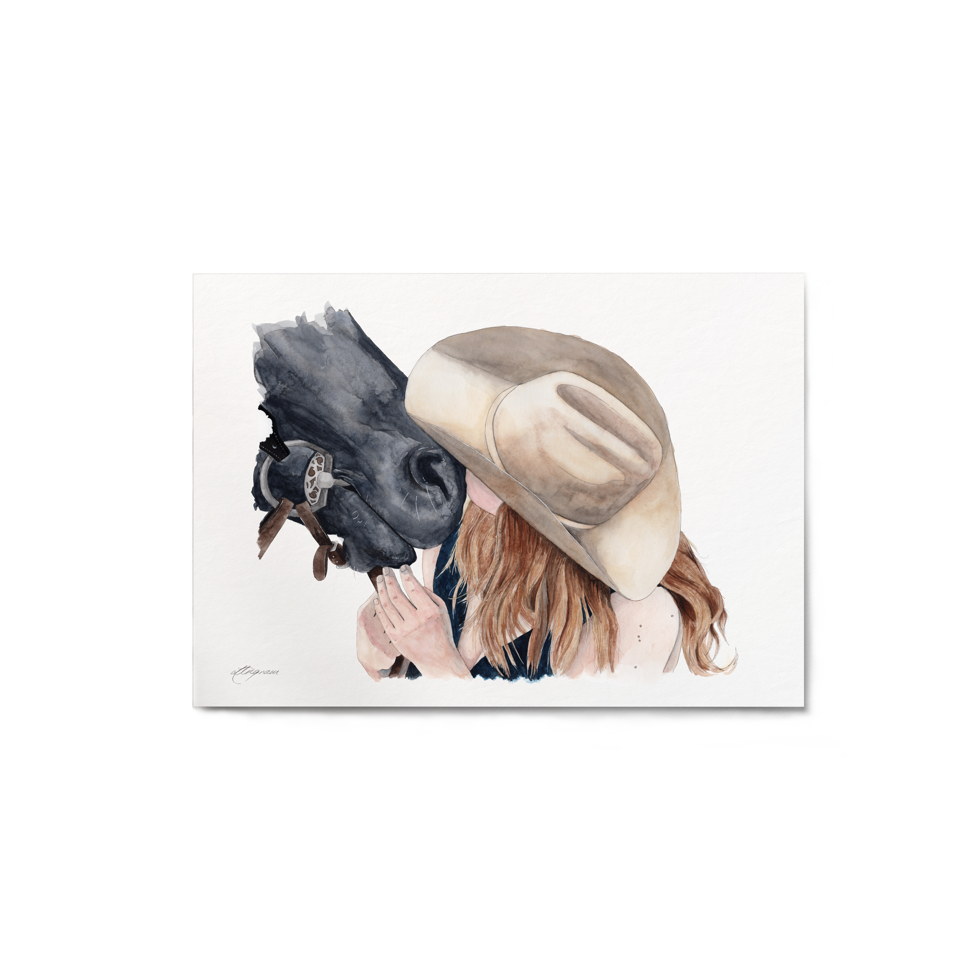 "Affinity" Print captures a touching moment between a girl and her horse, reflecting a deep bond of trust and companionship. This emotive artwork invites you to feel the quiet strength and connection shared between them, making it a heartfelt addition to any space that celebrates friendship and the spirit of the outdoors.