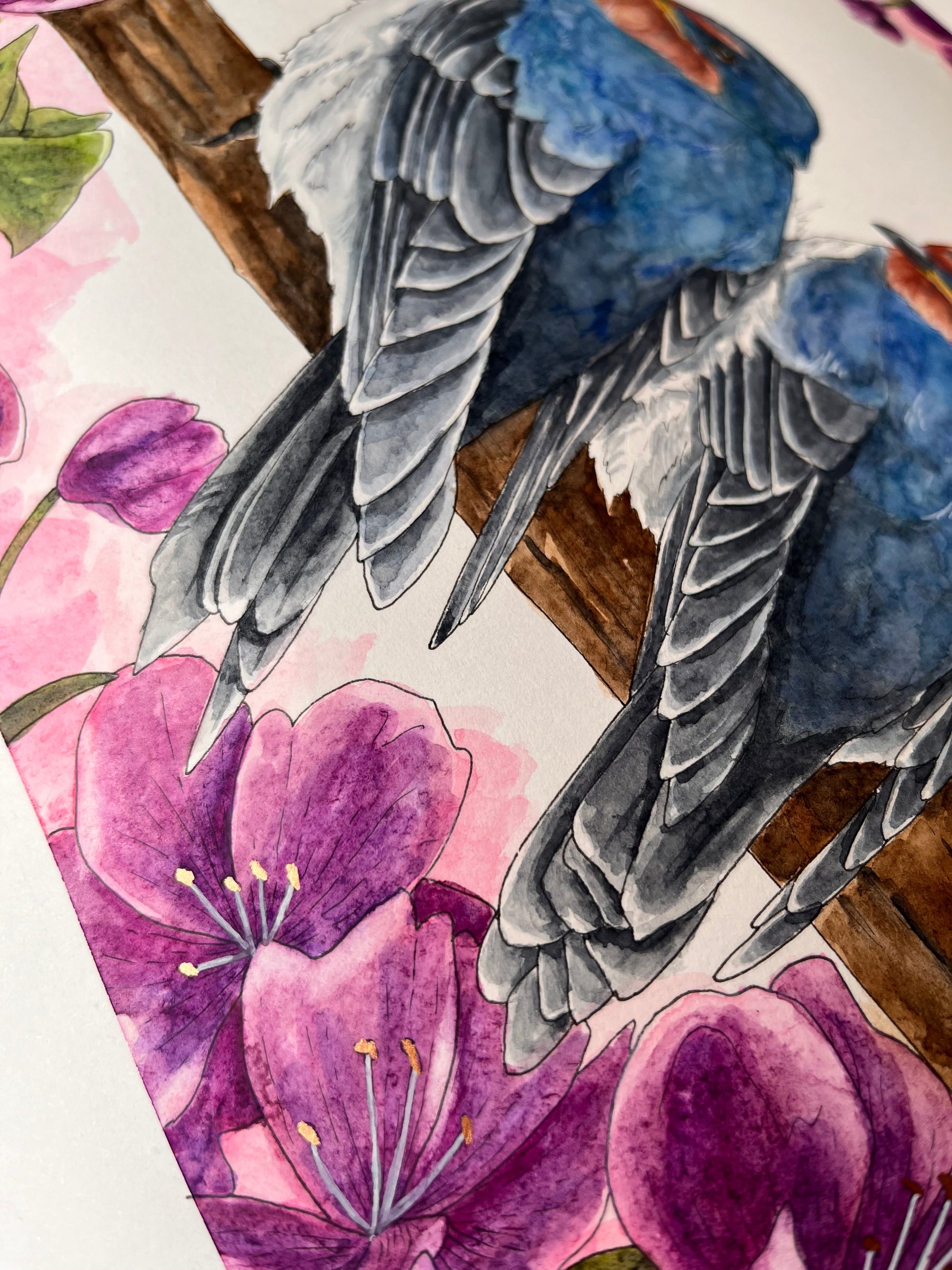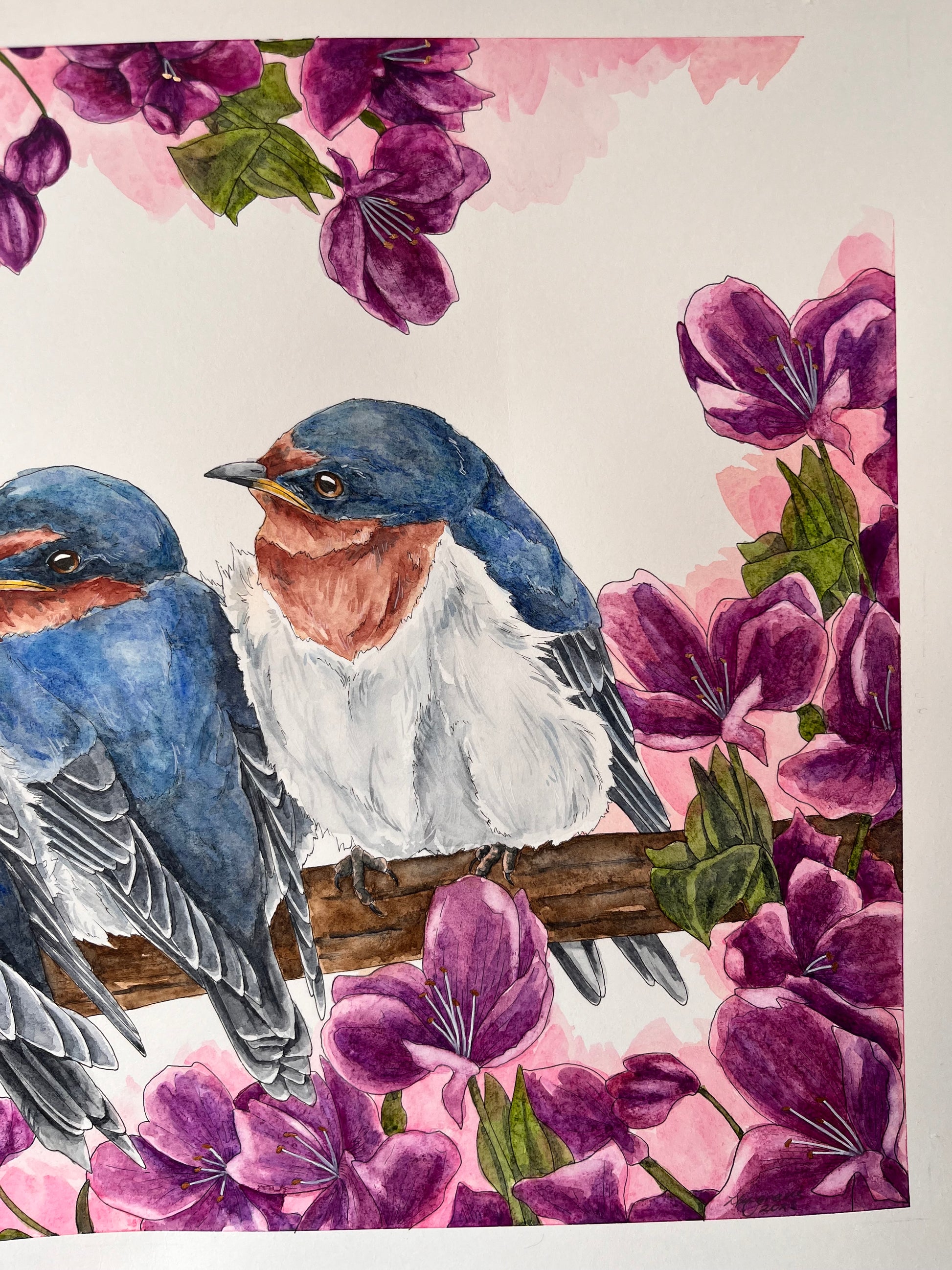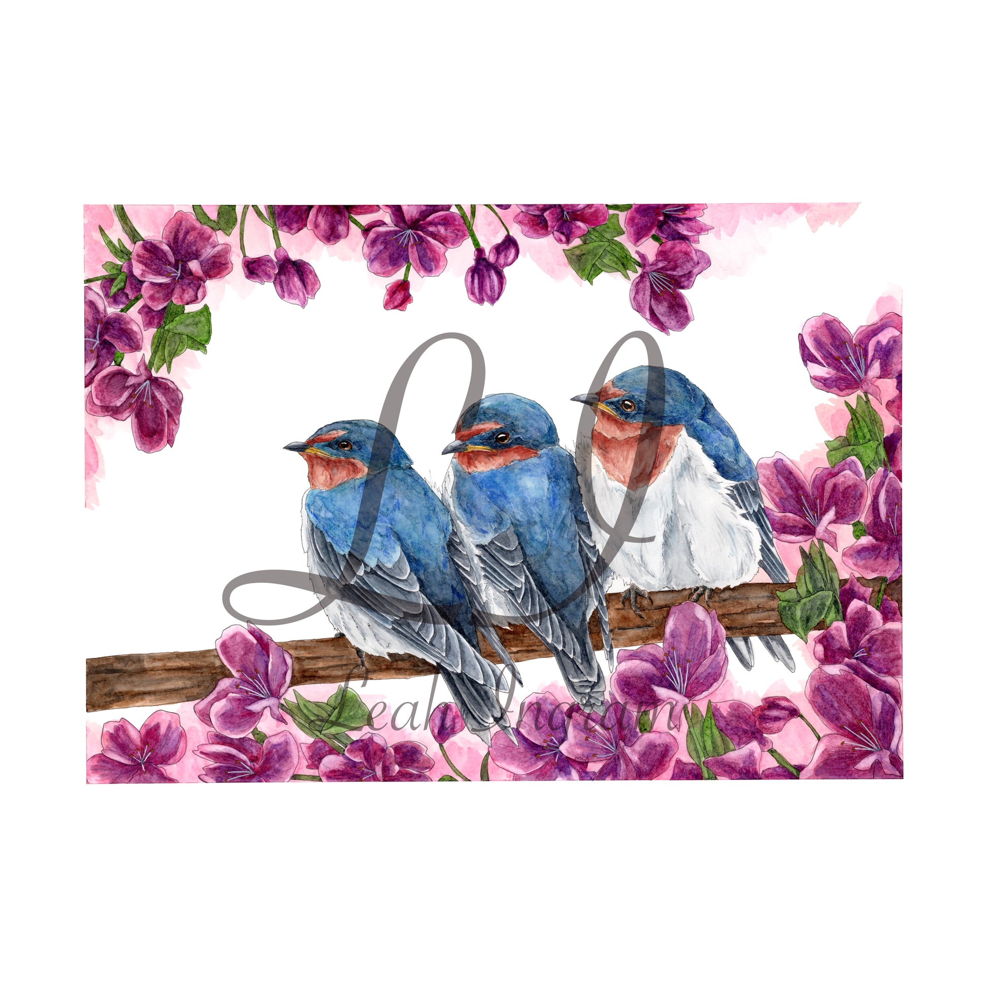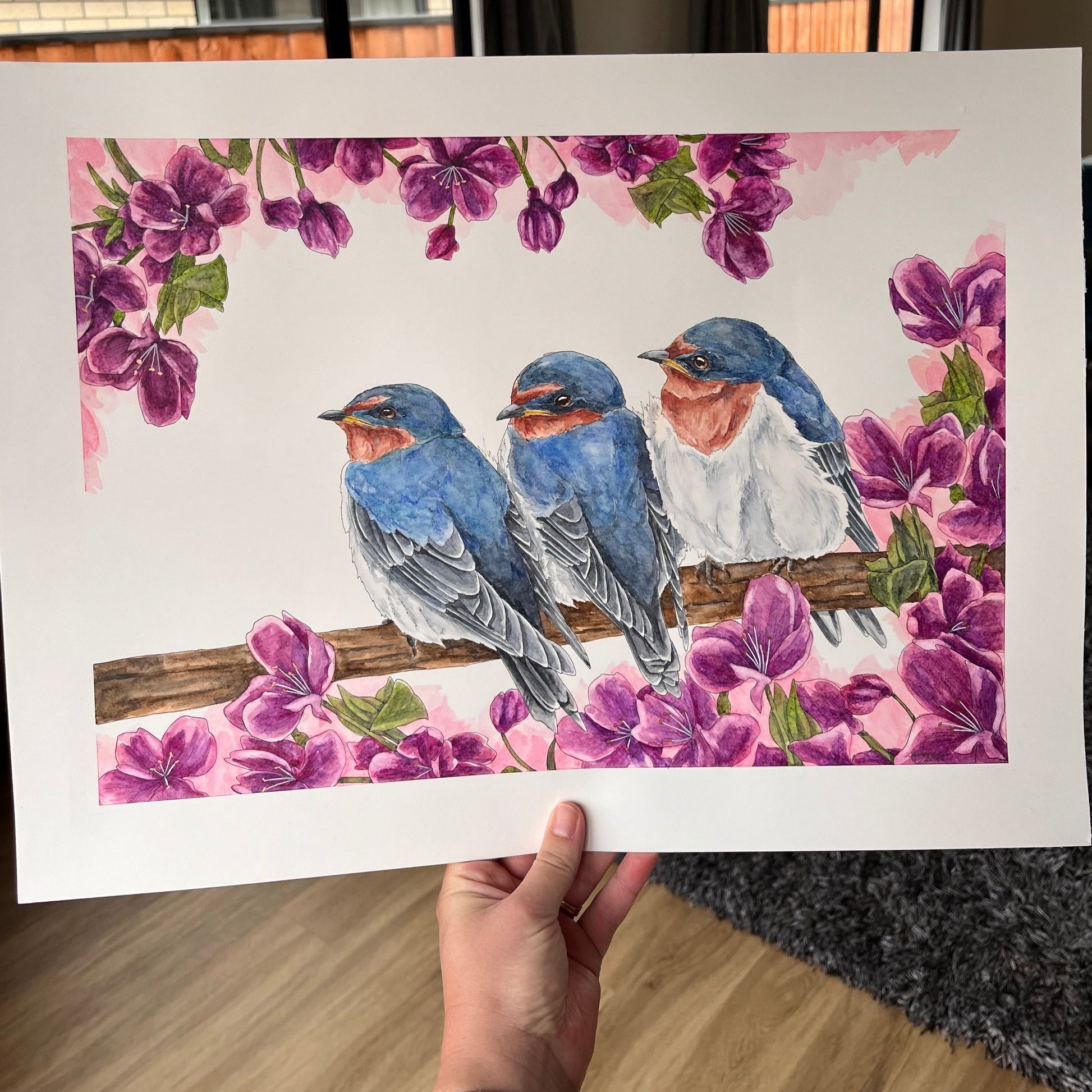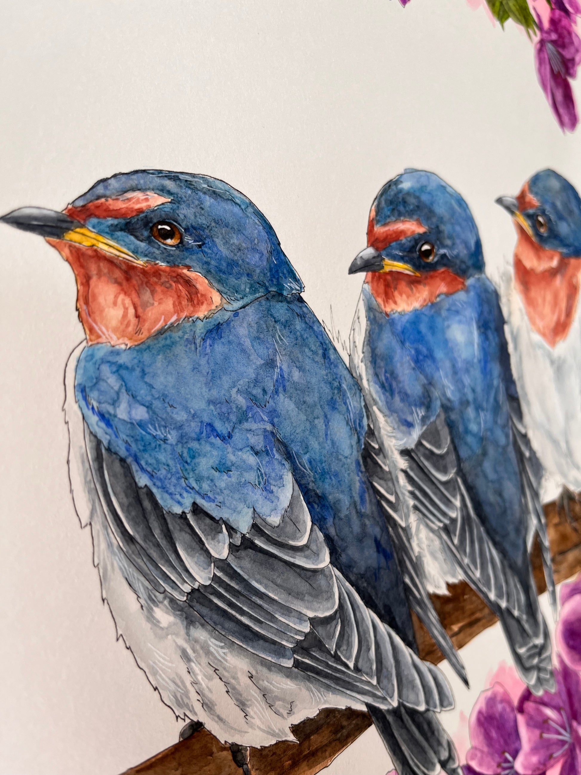 This original illustration is of three fluffy baby swallows nestled in together amongst delicate pink blossoms.
