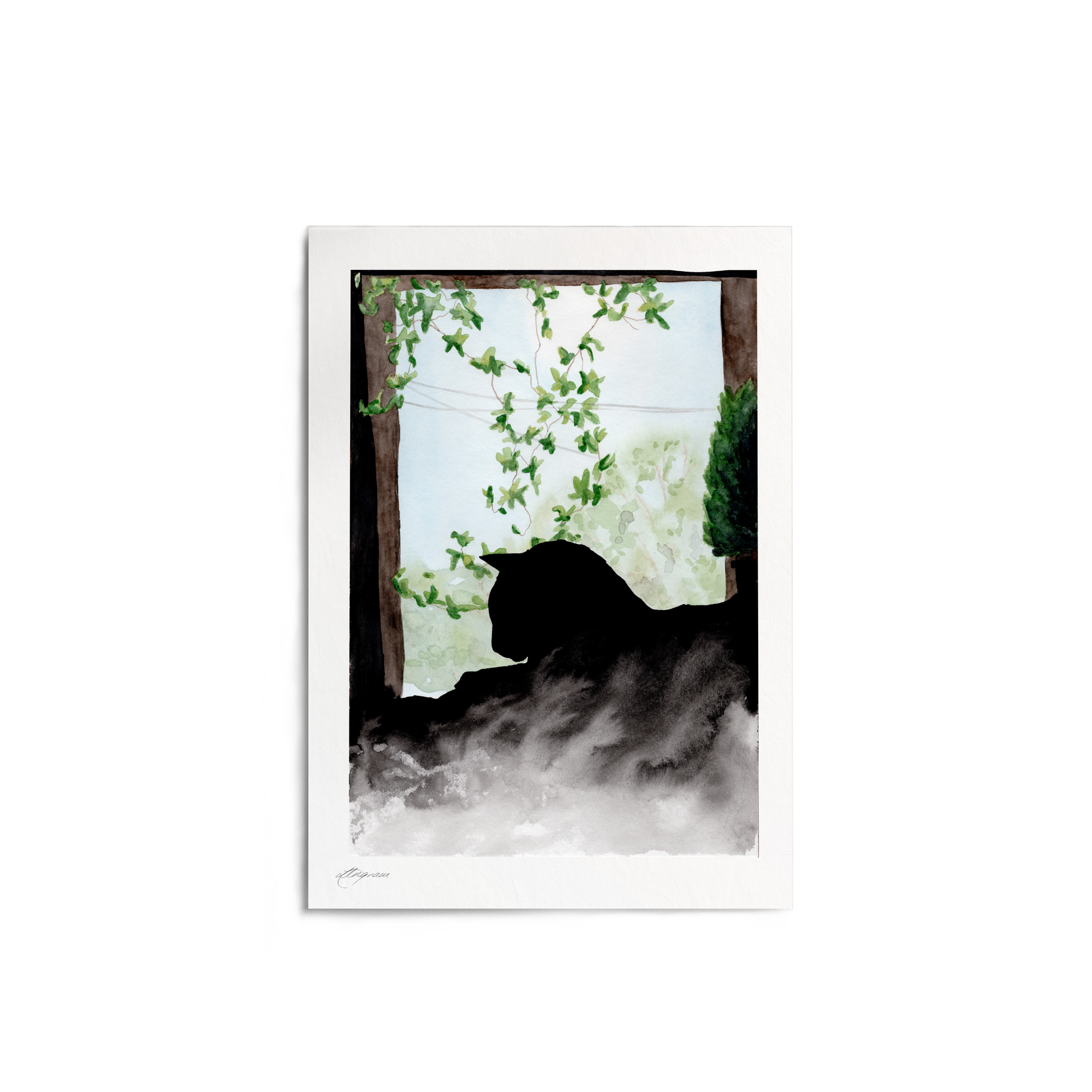 A serene moment captured in time—a cat perched peacefully on a sunlit window sill, gazing out at the world beyond. This evocative print invites tranquility into any space, celebrating the quiet beauty of simple, contemplative scenes. Perfect for cat lovers and those seeking a touch of calm sophistication in their home. Let this gentle illustration remind you to pause and find peace in life's stillest moments.