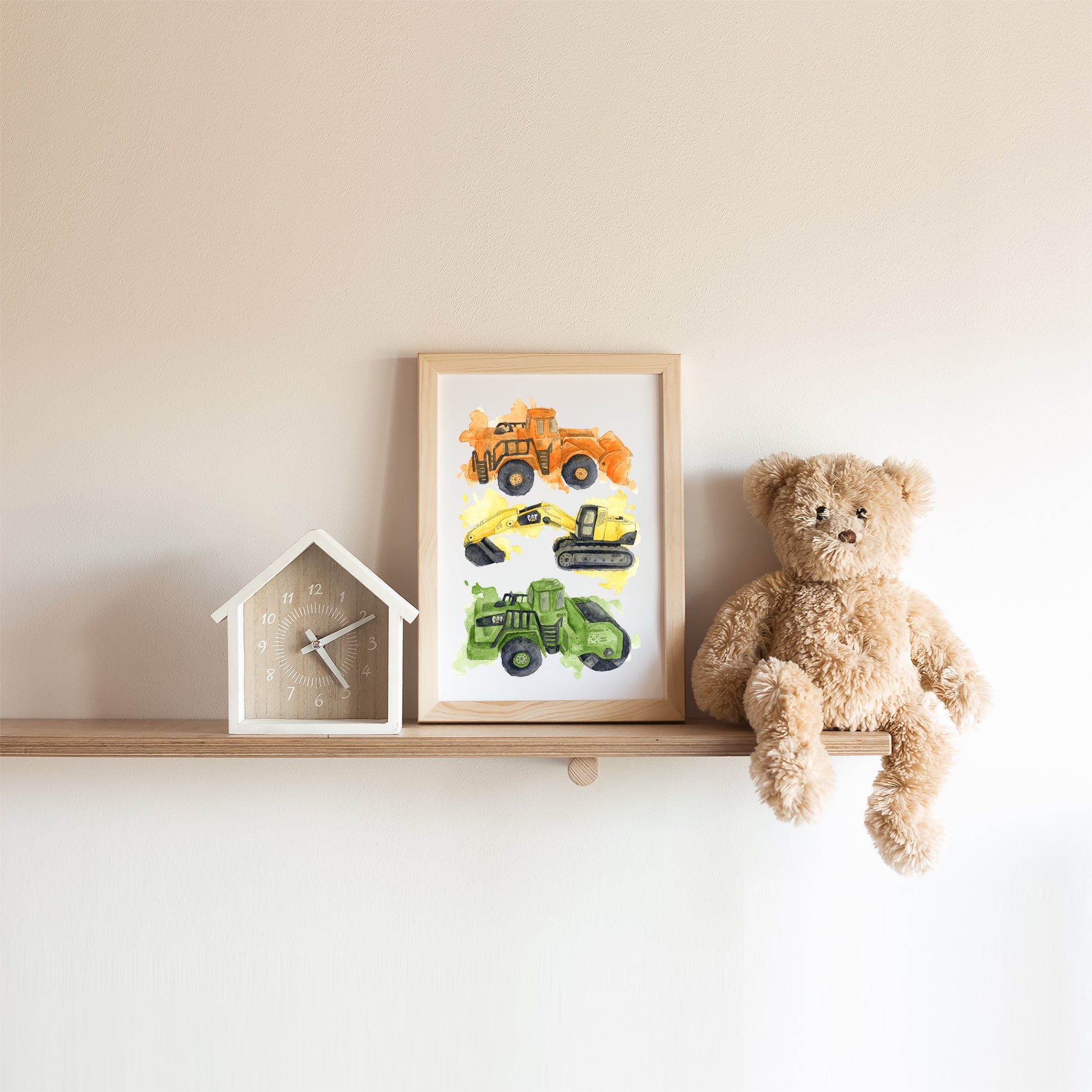 This open edition print illustrates three construction vehicles (a Front Loader, an Excavator and a Steamroller), all inspired by my boys favourite toys.