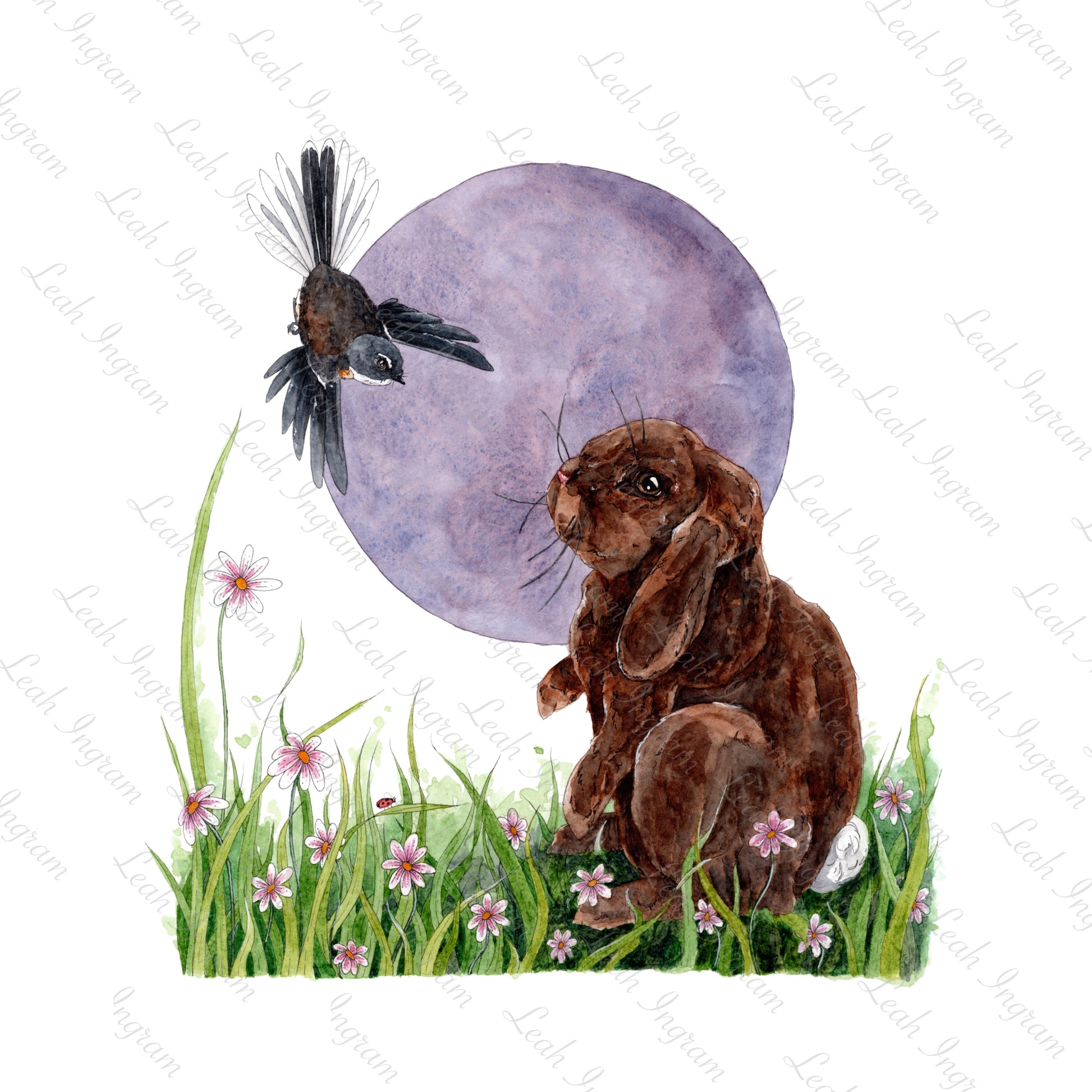 This original illustration is of "Curiosity" a chocolate bunny sitting with friends amongst the daisies, when a curious fantail swoops down to say hello.