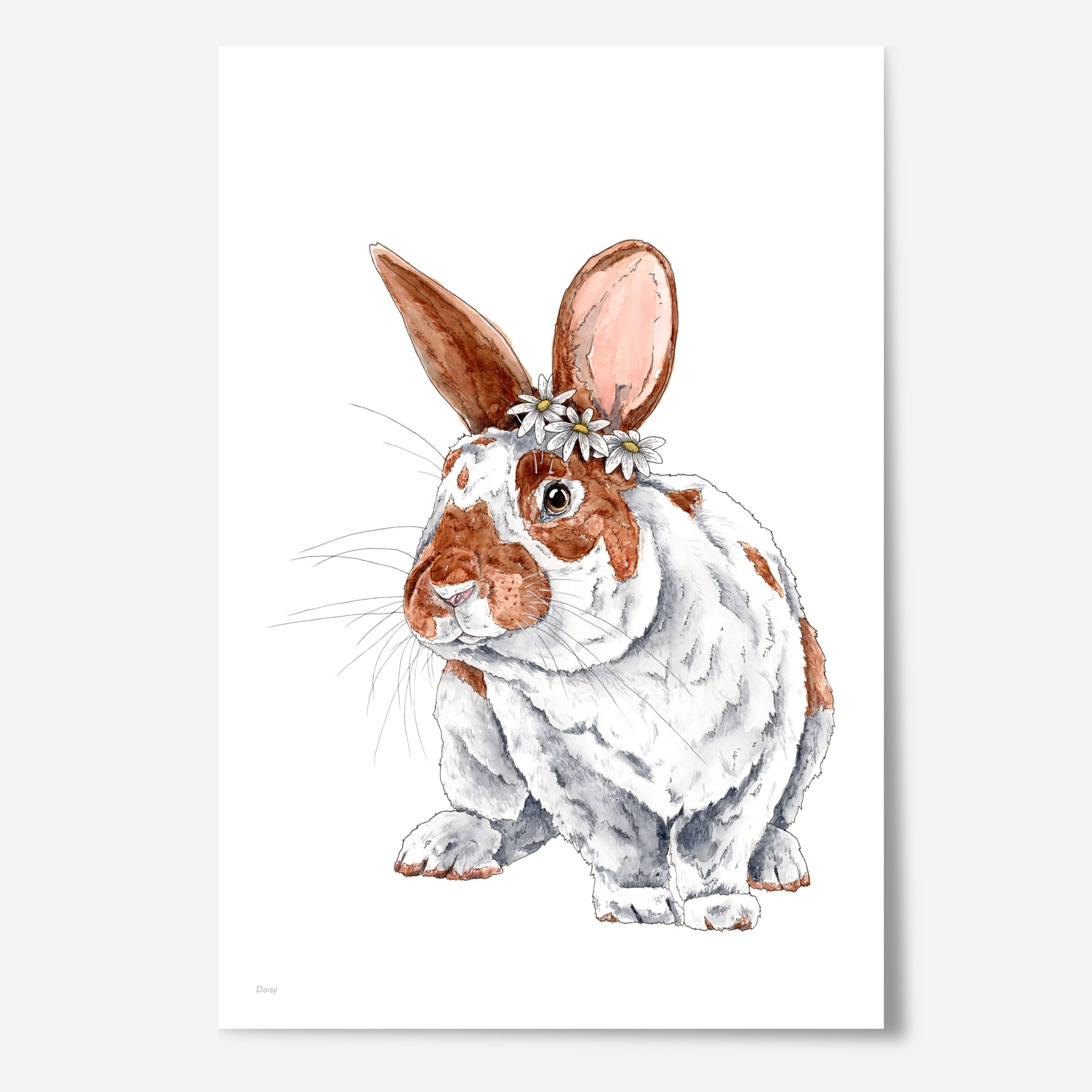 This open edition print illustrates a brown and white bunny rabbit with a daisy chain around one ear.