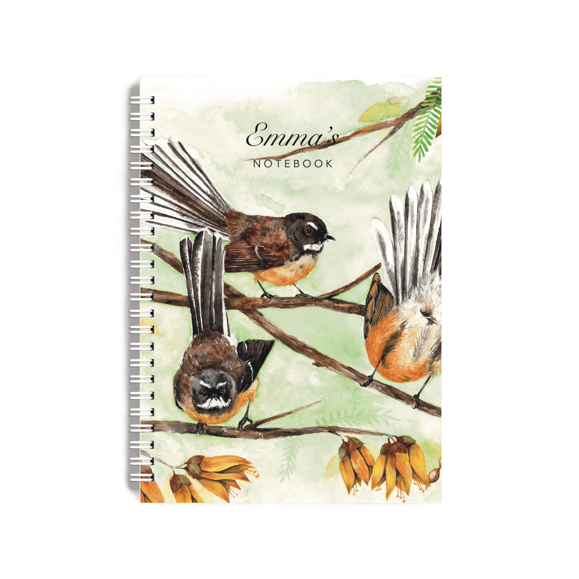 A 30-page notebook featuring the "Dance of the Pīwakawaka" illustration. Customise by choosing either plain lined or illustrated and personalising the cover.