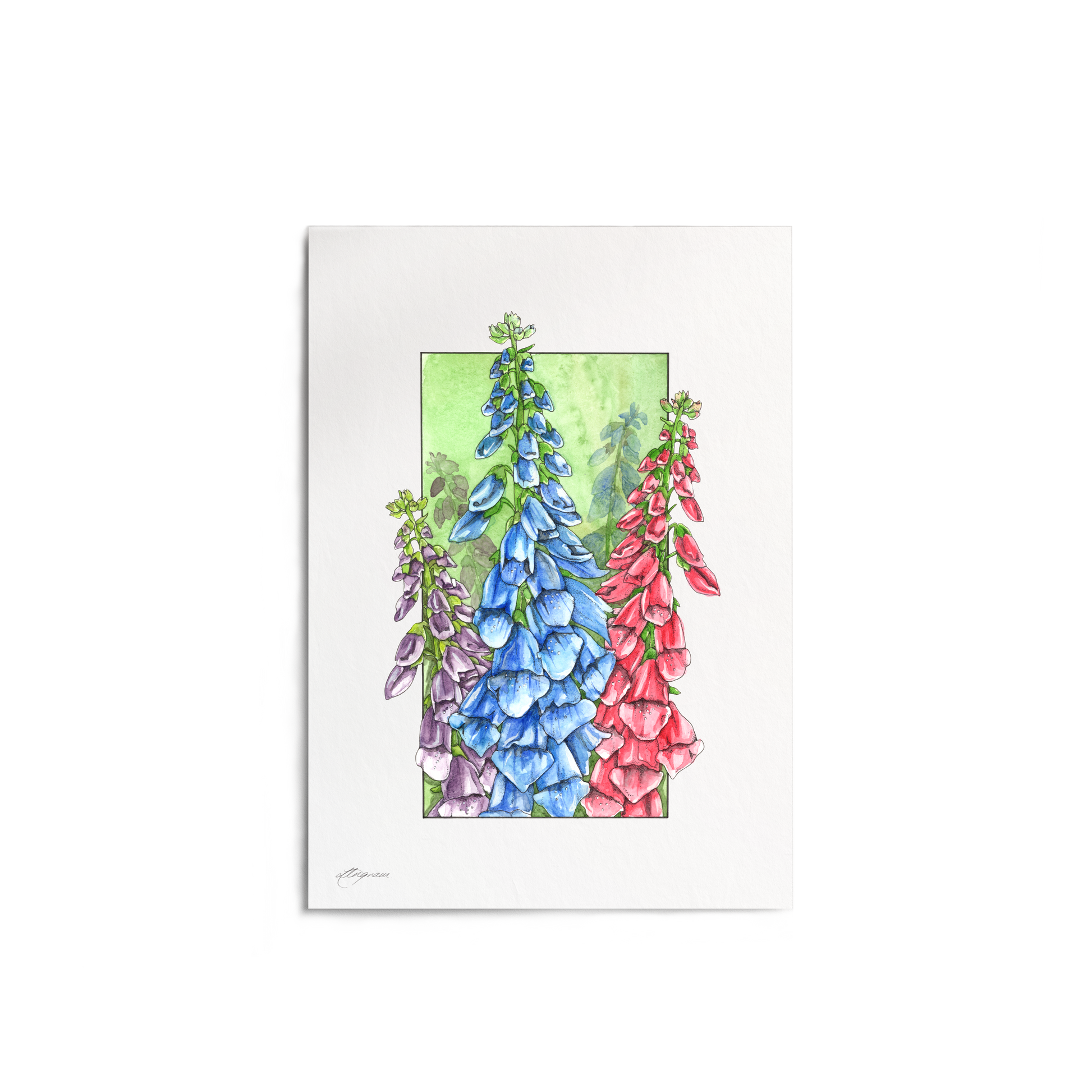 Tall and stately, foxgloves bring an enchanting wildflower charm to any space. Their distinctive spired blooms in soft purples, pinks, and whites evoke a sense of botanical wonder and natural elegance. This print captures the delicate beauty of these beloved garden flowers, celebrating their graceful presence and the quiet magic they bring to meadows and borders. Perfect for nature lovers and those who cherish the romance of traditional cottage gardens.