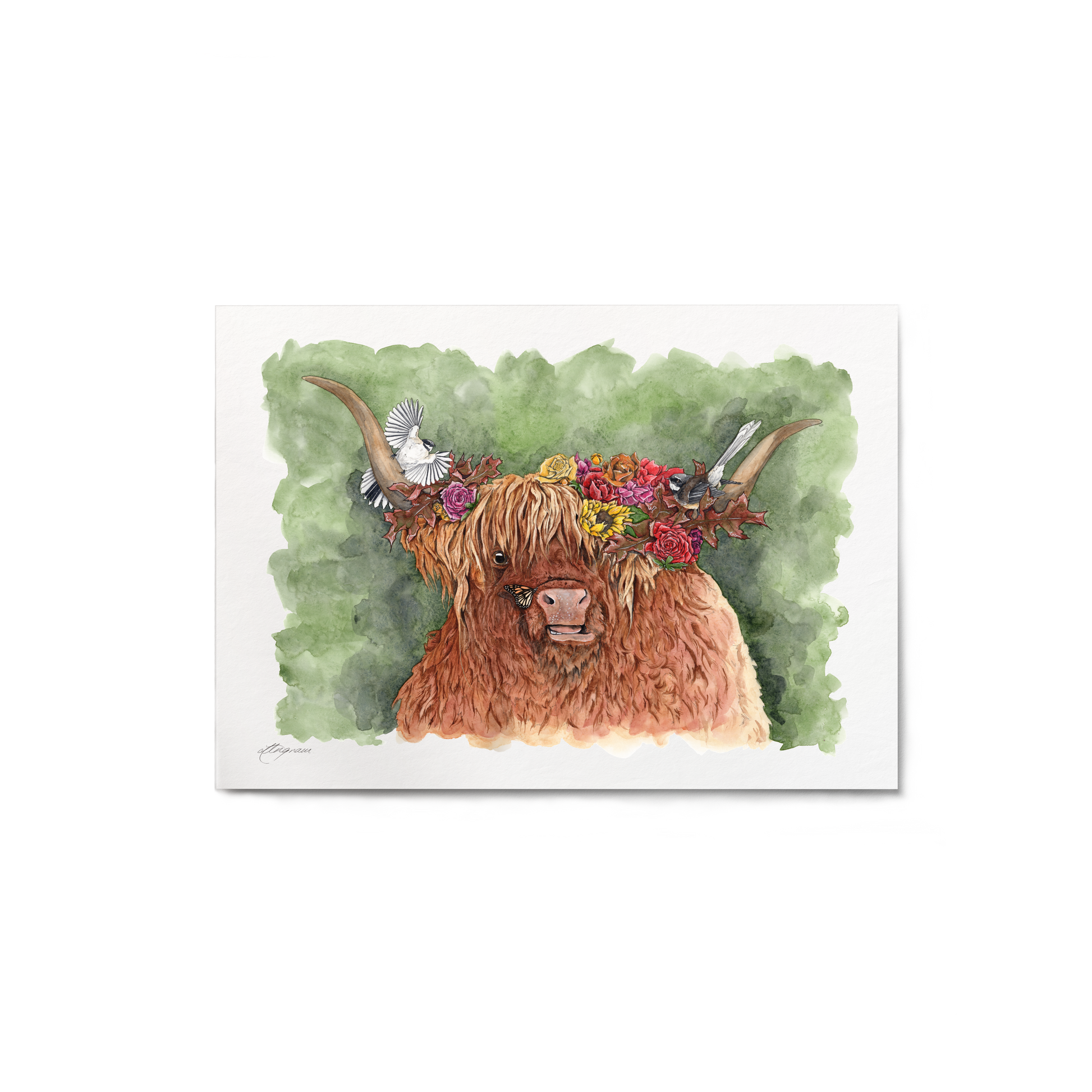 A majestic Highland cow stands adorned with delicate flowers and native fantails perched gracefully upon its iconic horns. This charming illustration celebrates the beauty of nature's gentle creatures, blending pastoral charm with whimsical detail. Perfect for those who cherish wildlife, rural landscapes, and the magic found in unexpected moments. A heartwarming addition to any space seeking warmth and character.