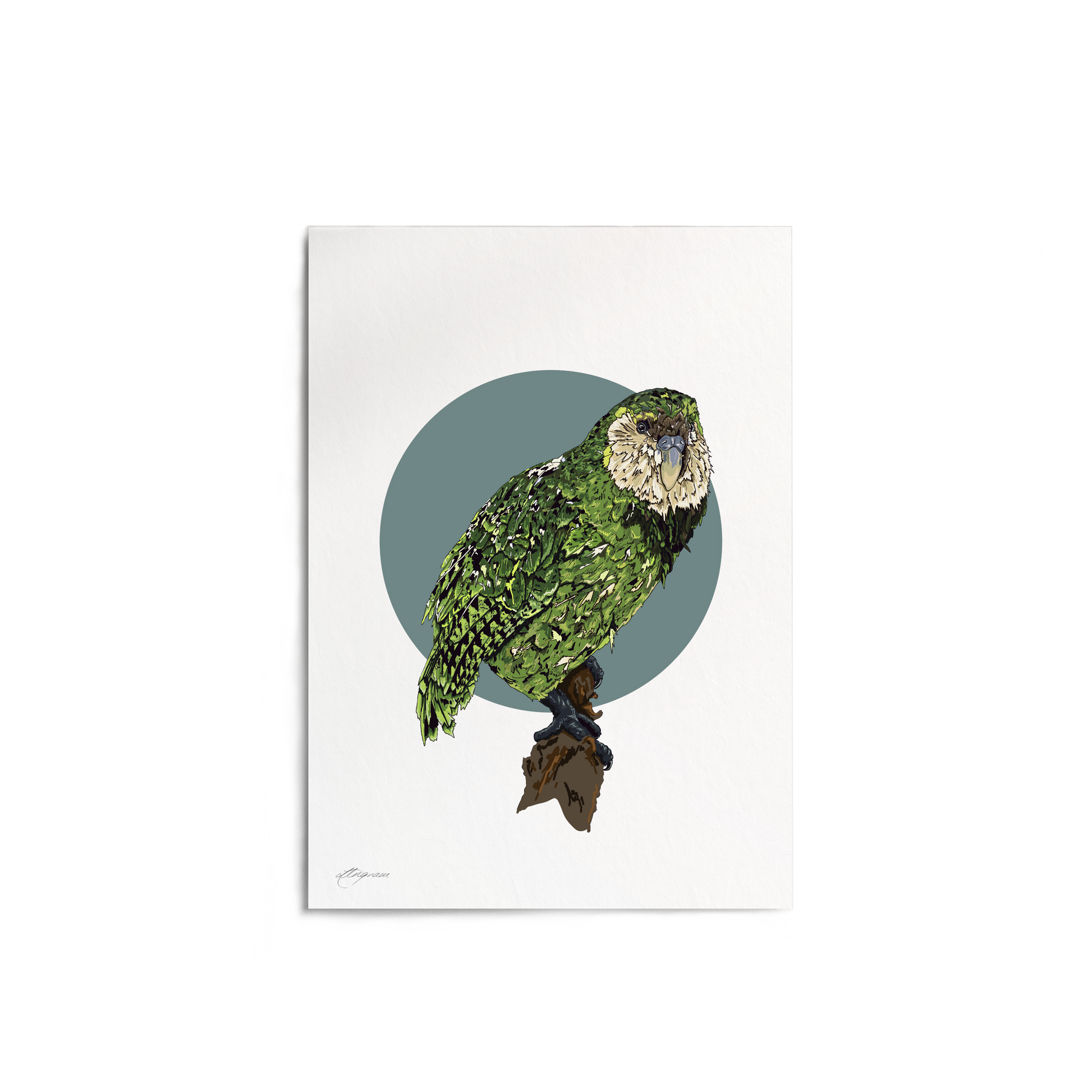 Meet the Kākāpō, New Zealand's most enchanting and critically endangered parrot, captured in this beautifully digitally drawn print. This flightless native treasure, with its distinctive moss-green plumage and endearing personality, represents the heart of our unique wildlife. Perfect for nature lovers and conservation advocates, this artwork celebrates the kākāpō's remarkable resilience and charm. Display it proudly to spark conversations about protecting Aotearoa's irreplaceable taonga and inspire others to cherish our feathered friends.