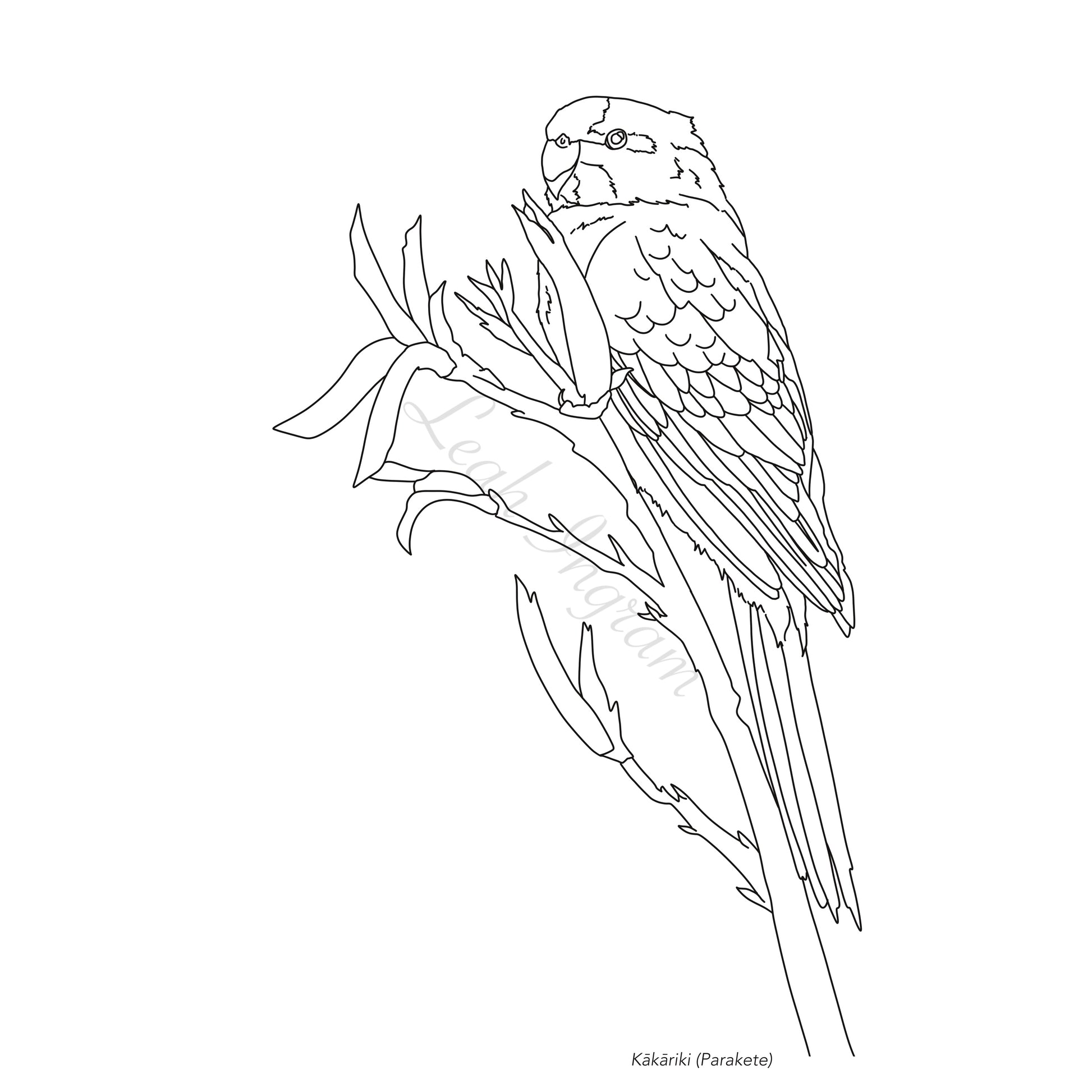 You will receive a PDF file of the "Kakariki" line art (without the watermark) to print as many times as you like from your home printer, or local print shop. This is for personal use only and is not to be onsold.