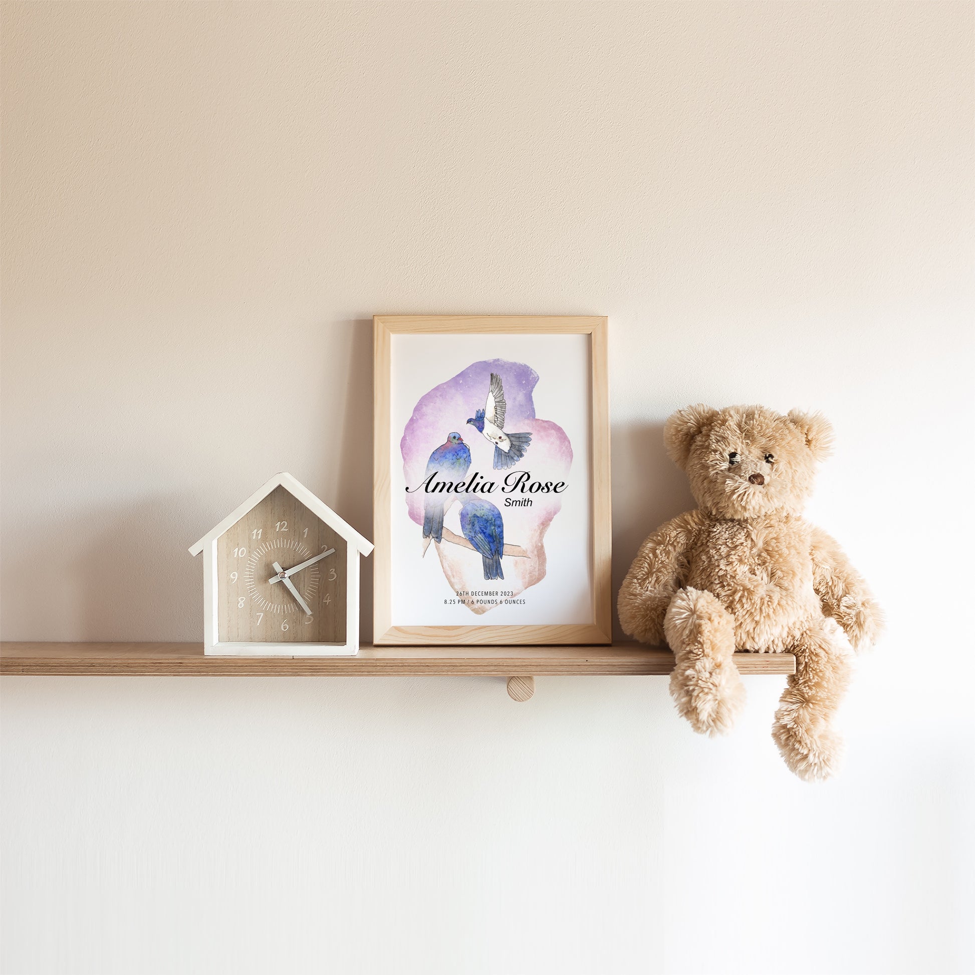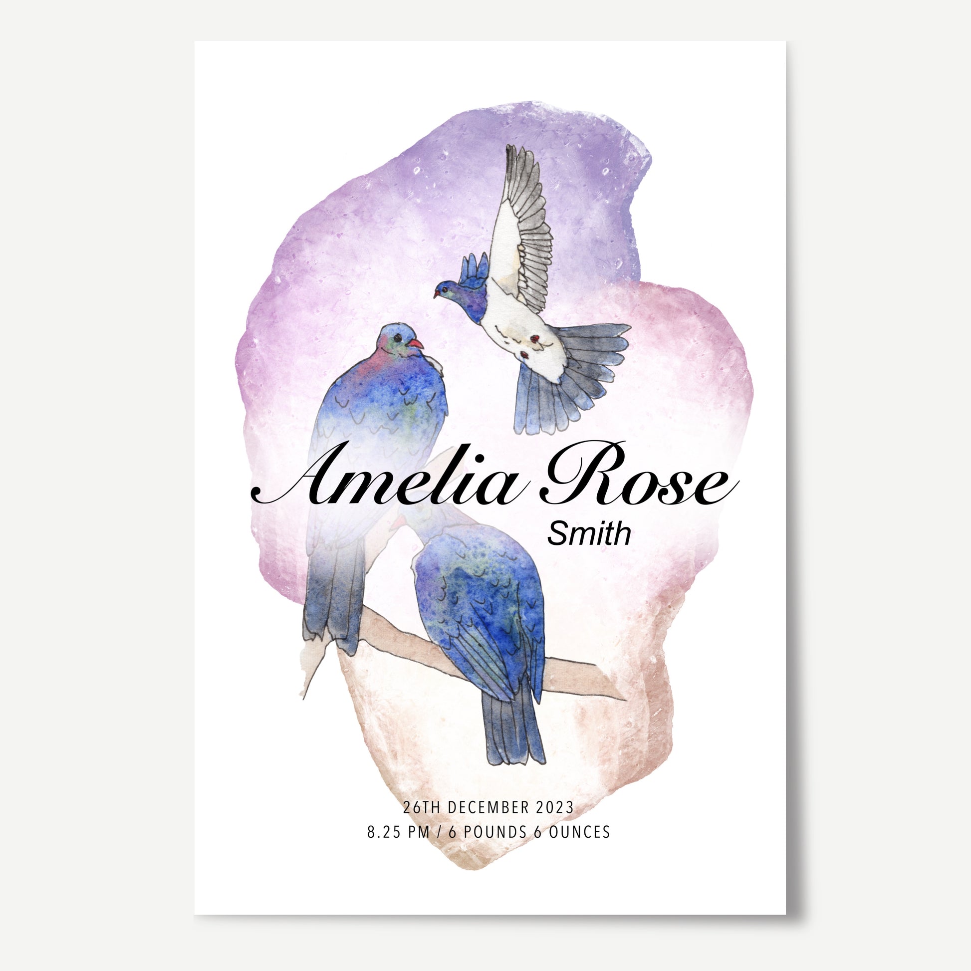 This customisable Birth Details print illustrates three New Zealand Kererū against a wash of purple and pink. Please provide the following details in the notes section at checkout: