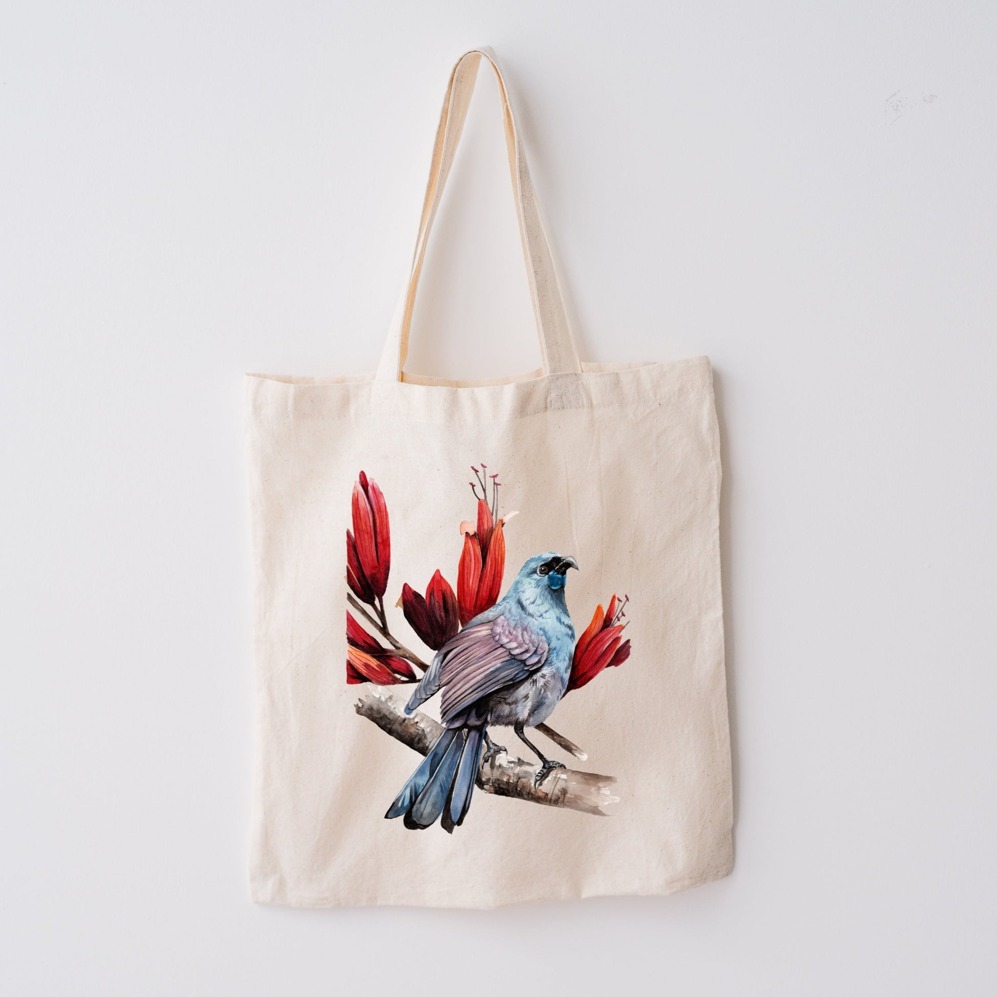 This 100% cotton tote bag features a print of a Kōkako perched on a branch amongst Harakeke flax flowers.