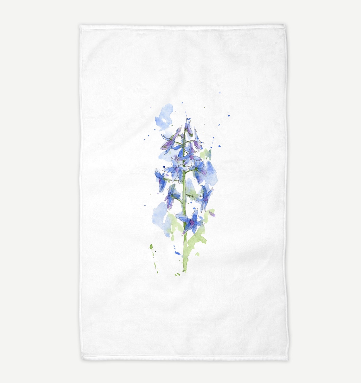 This white 100% cotton tea towel features a print of Larkspur, the birth month flower for July.