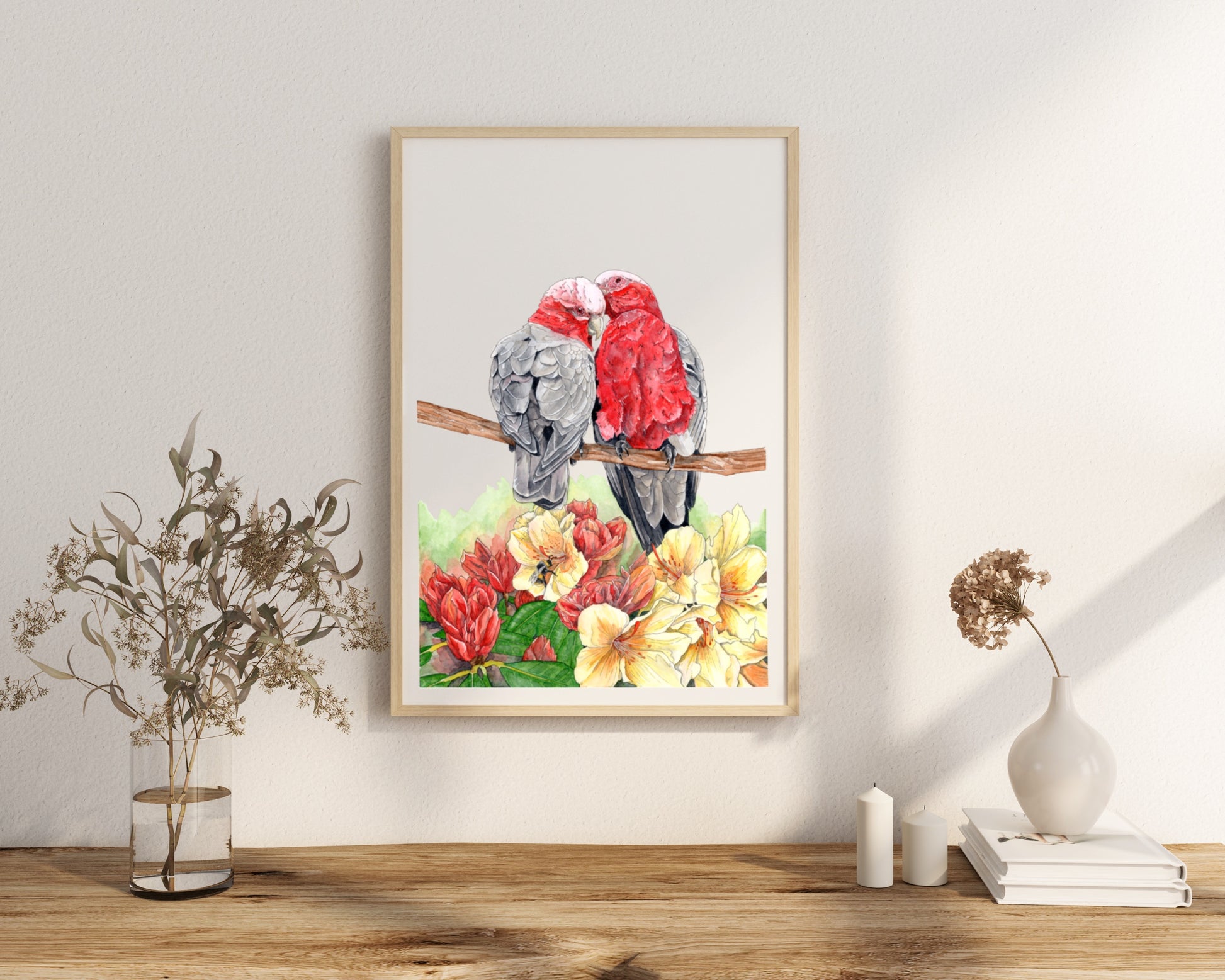 This open edition print illustrates a Galah pair perched above blossoms of yellow, orange and red rhododendrons.