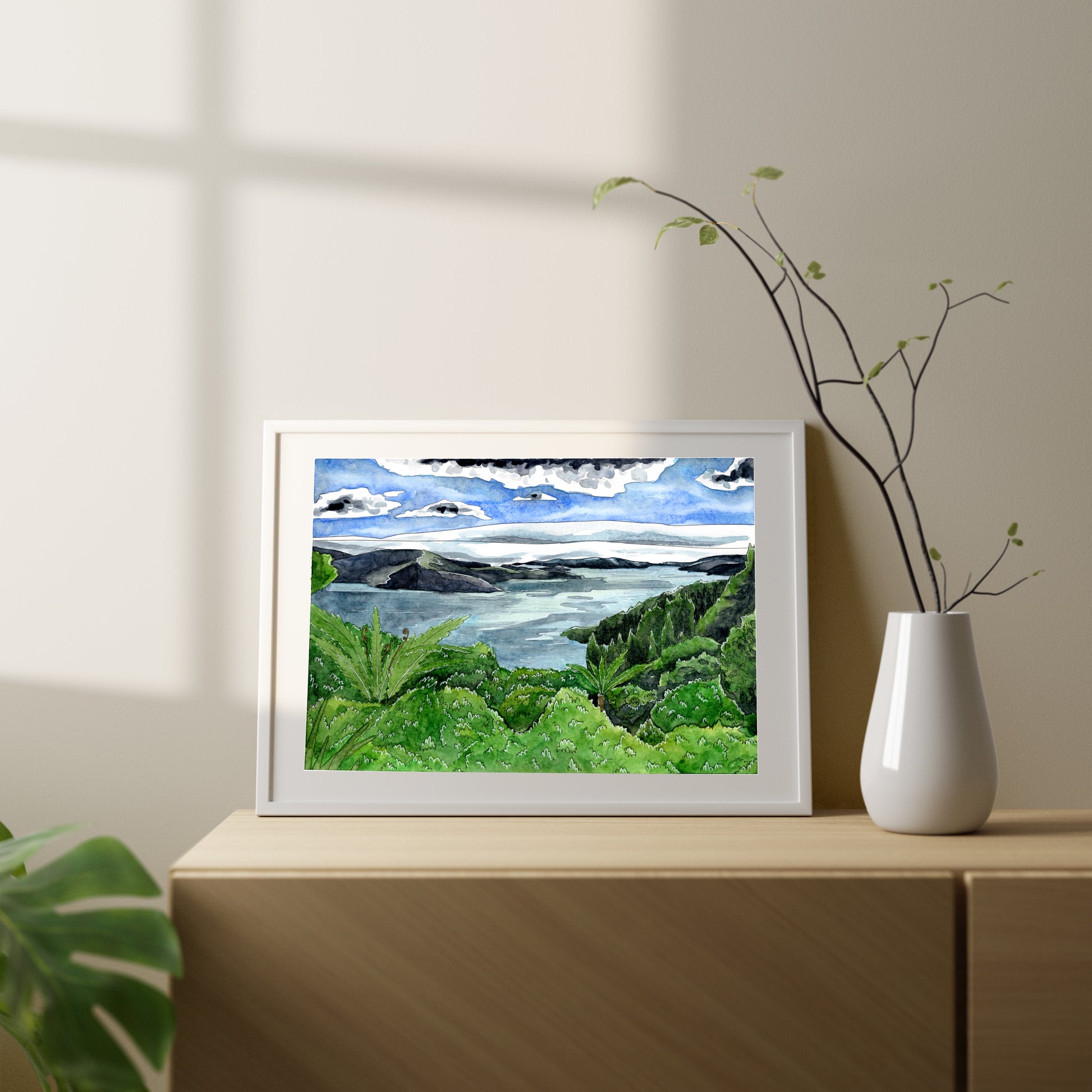 This open edition print illustrates the rolling hills filled with New Zealand native greenery, overlooking a stunning body of water and mountains in the distance.