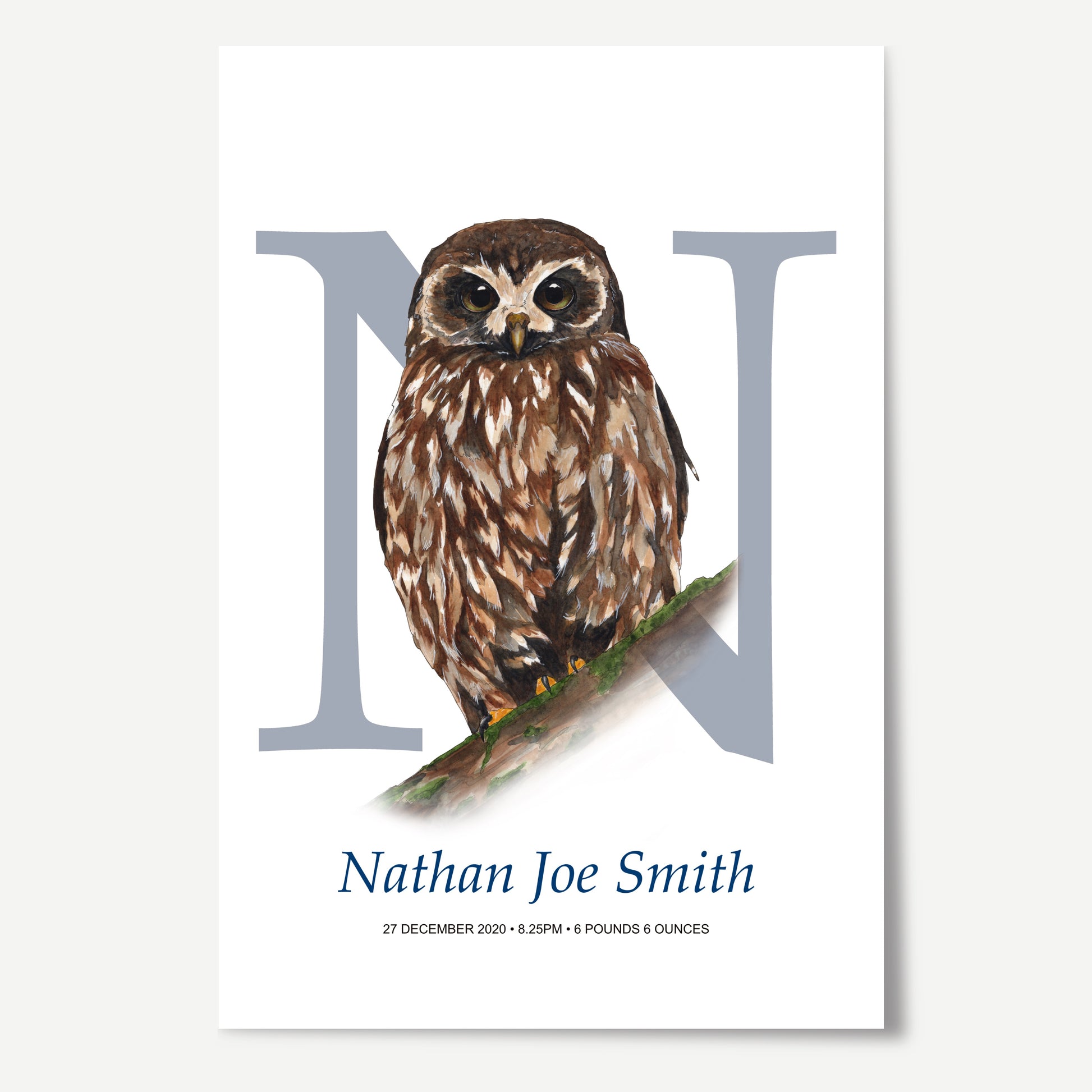 This is a customisable letter "N" print. You can choose the bird / animal from the selections below. You can leave out birth details and just include a name or quote etc. You are welcome to request a proof that I can email to you before printing to ensure we have it right.