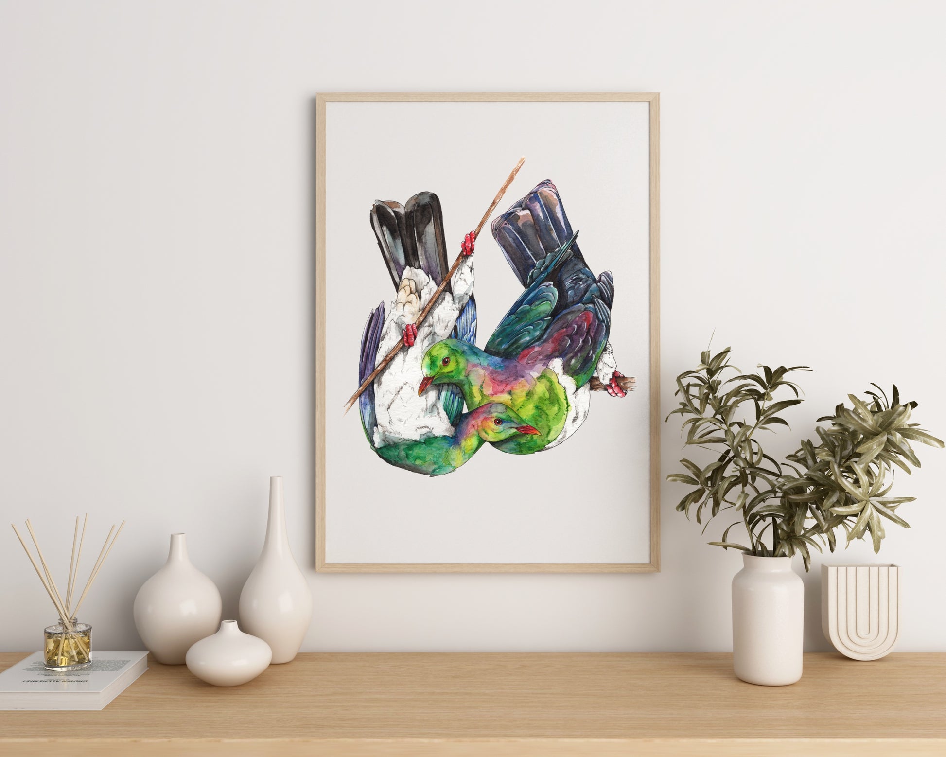 This open edition print is a highly detailed illustration of two New Zealand Kererū entwined, from my native pair series.