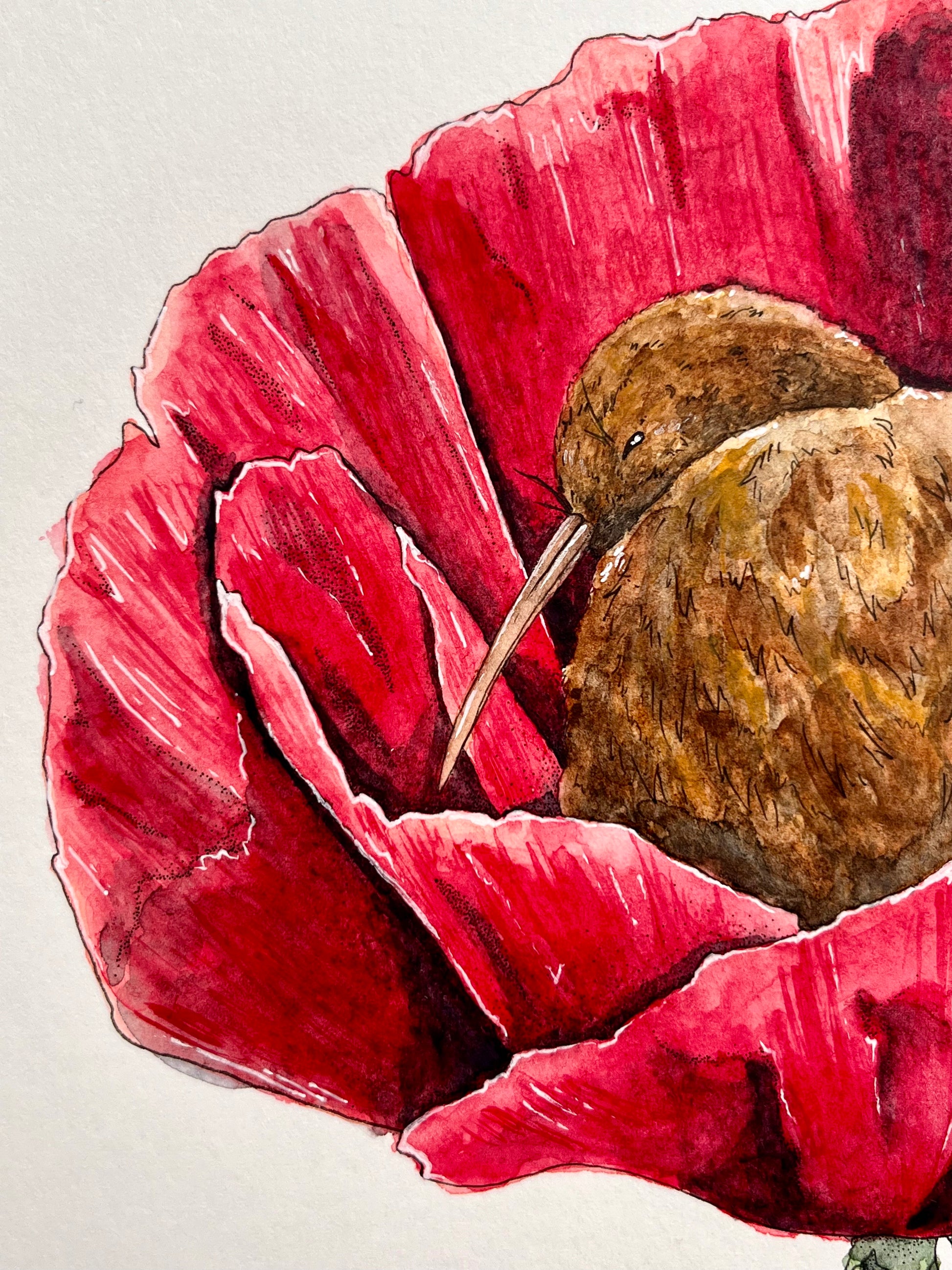 This original illustration is of a Kiwi nestled into a poppy, an emotive representation of ANZAC.