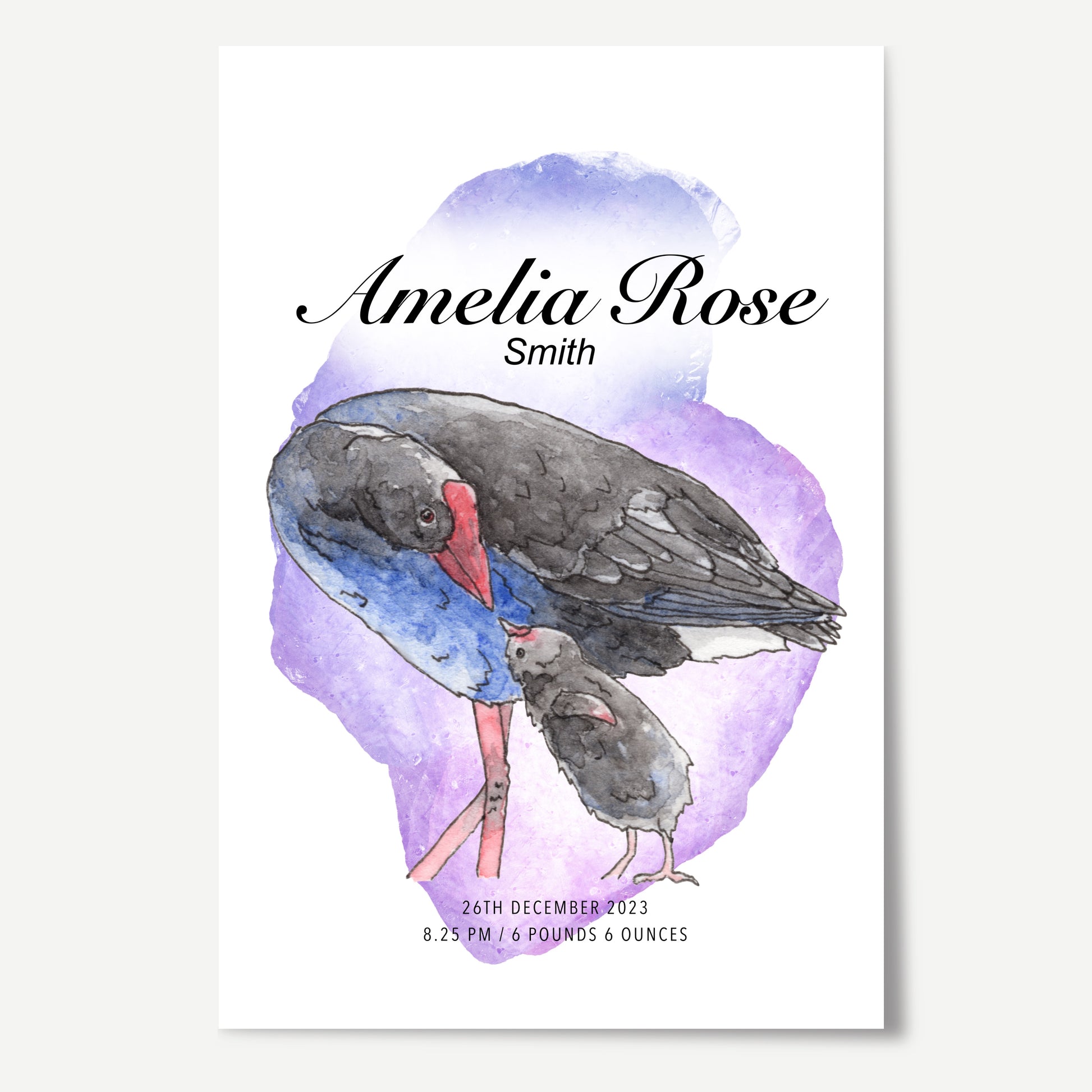 This customisable Birth Details print illustrates two New Zealand Pūkeko against a wash of purple and blue. This is a customisable "Birth Details" print. Please provide the following details in the notes section at checkout: