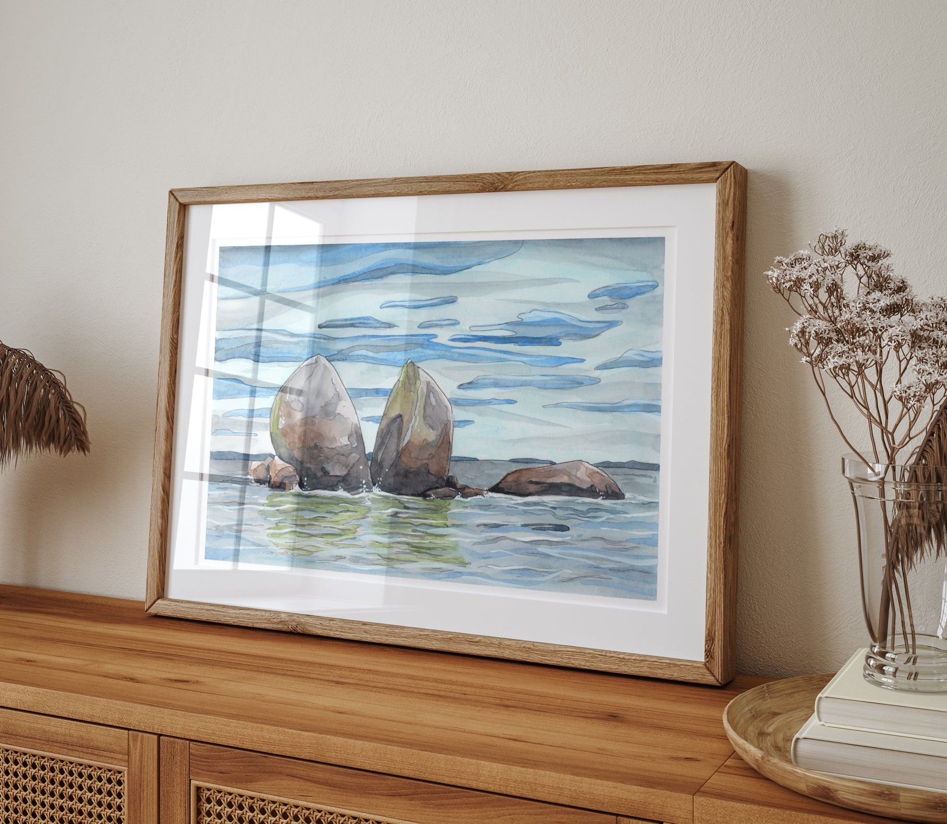 This open edition print illustrates the serene ocean outlook of Split Apple Rock in the Tasman Bay of New Zealand. An iconic scene originally painted with watercolour and ink, my first landscape painting as a professional artist.