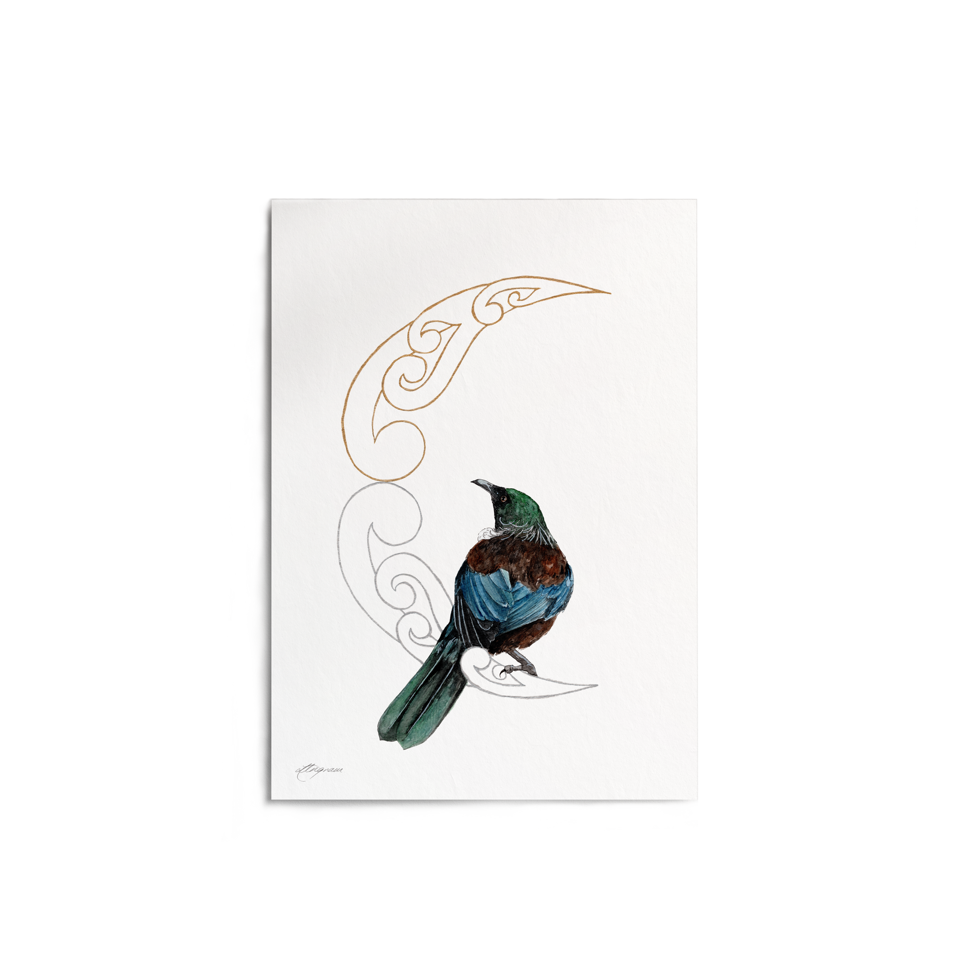 A graceful tūī perches upon a luminous crescent moon, adorned with flowing silver and gold koru that spiral like the bird's own elegant song. This enchanting print captures the essence of Aotearoa's native beauty, blending traditional Māori design elements with the serene magic of moonlit moments. Perfect for those who cherish the natural world and cultural heritage, this artwork brings warmth and wonder to any space, inviting quiet reflection and connection to the land.