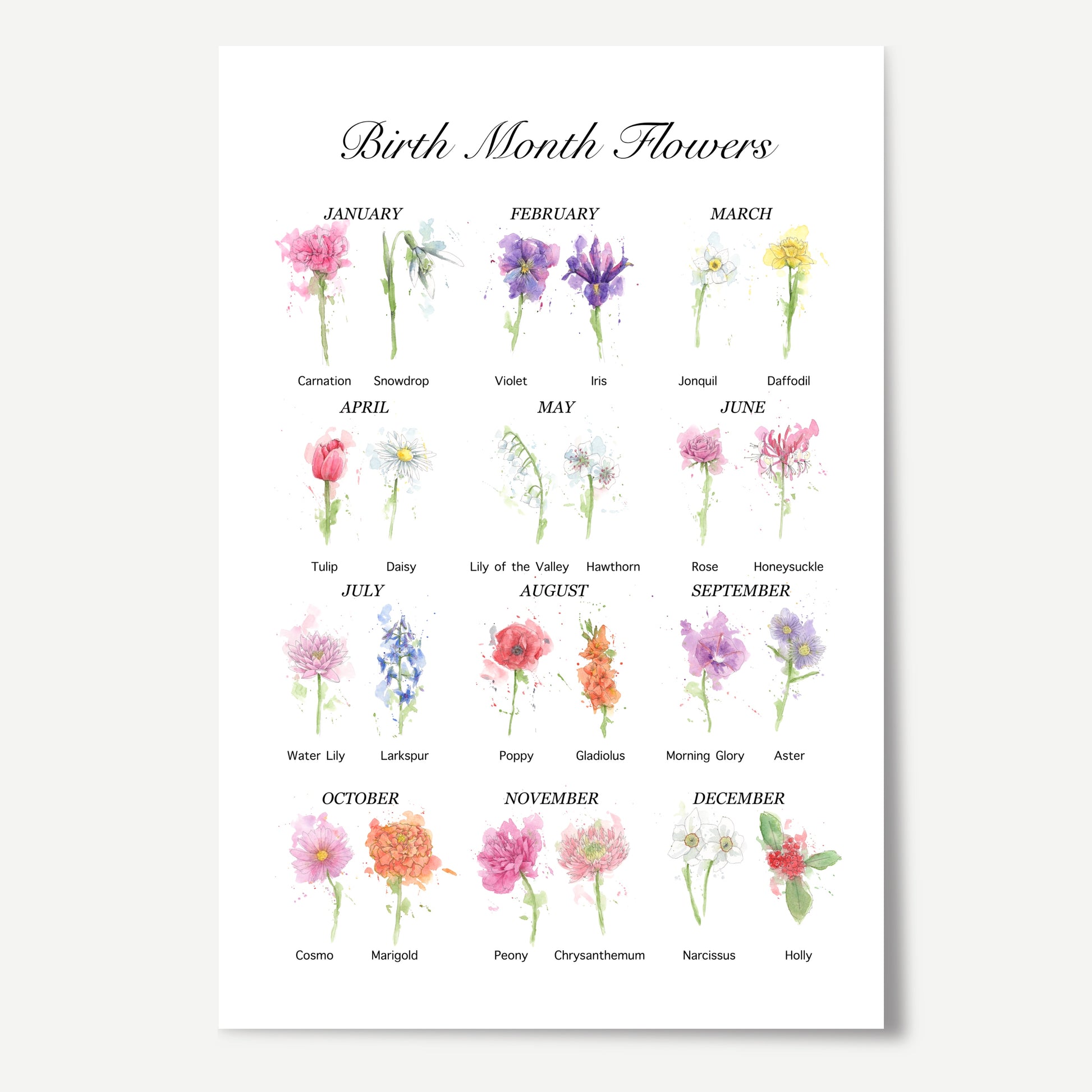 This open edition print illustrates the two versions of flowers that represent each birth month. Every month and name of each flower is included on this comprehensive guide, including beautiful, bright and loose illustations for each flower.